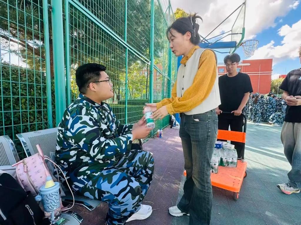 烈日下的训练场,新生训练间隙,辅导员李科含老师的身影格外显眼。她走到队列旁,俯身关切地询问着同学们的身体状况,提醒大家累了就到阴凉处歇会儿,千万别硬撑;分发藿香正气水和矿泉水时,也不忘多叮嘱几句,让大家天热及时补水,不舒服随时找她。没有华丽的话语,却像一阵凉风,悄悄驱散了训练的疲惫,让温暖住进了每个人心里。