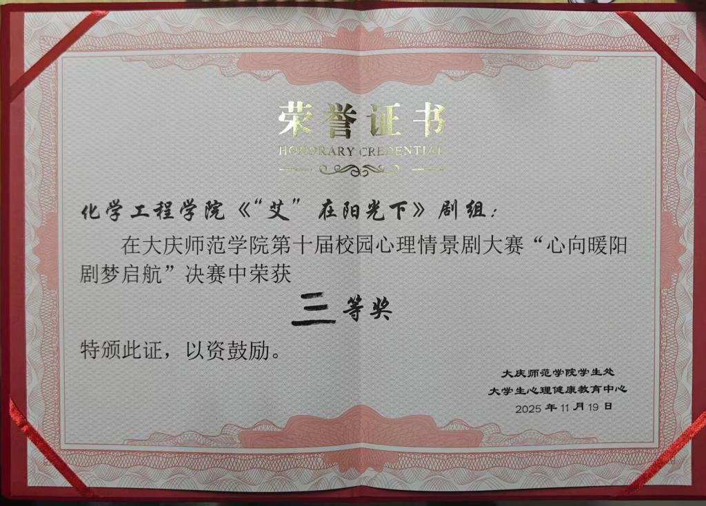 2025年11月19日,大庆师范学院第十届校园心理情景剧大赛“心向暖阳,剧梦启航”决赛圆满落幕。化学工程学院的心理剧《“艾”在阳光下》凭借深刻的主题立意、真挚的情感表达与精心的舞台呈现,在众多参赛作品中脱颖而出,最终荣获三等奖。