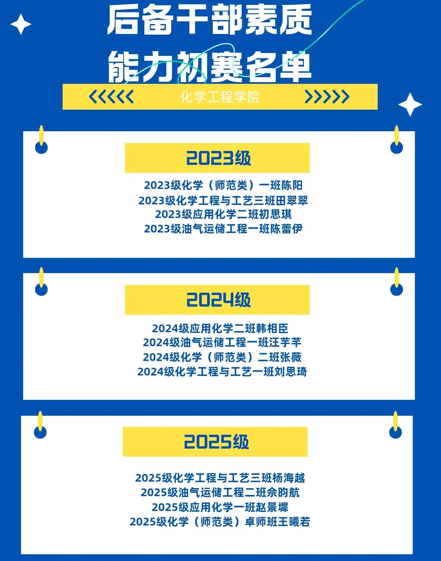 为进一步夯实班级后备干部队伍基础,提升学生骨干的服务意识与实践能力,充分发挥其在班级凝聚力建设、学风优化中的带头作用,11月16日化学工程学院决定举办“精研化工底蕴 竞展骨干风采”班级后备干部综合素质大赛。