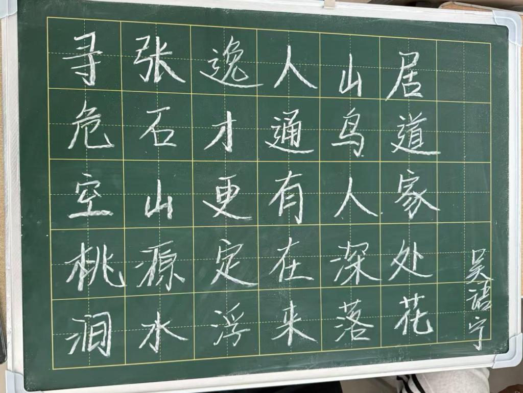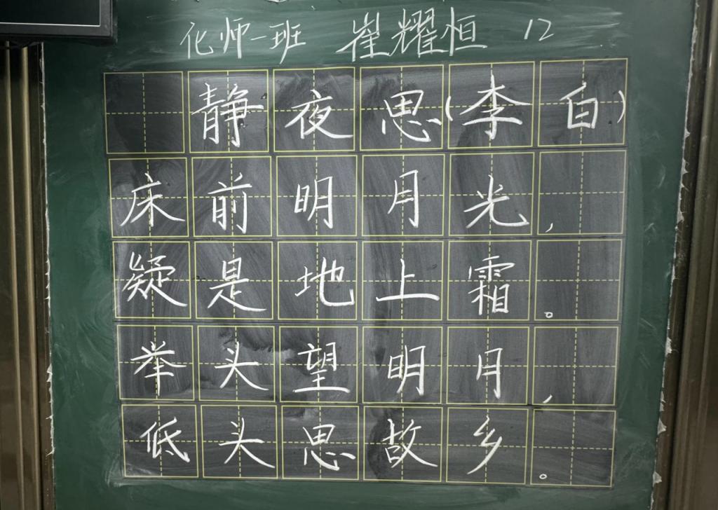 粉笔字训练则聚焦课堂实用场景,同学们在黑板前挥毫落笔,完成指定内容书写的同时,精心设计板书布局。从字体大小到排版逻辑,每一处细节都反复打磨,有效提升了粉笔字书写速度与美观度,为今后打造清晰、高效的课堂板书打下坚实基础。