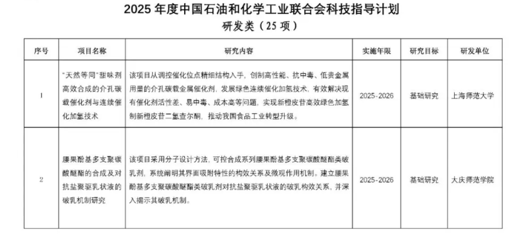 中国石油和化学工业联合会科技指导计划自2011年启动以来,始终得到国家相关部门的高度认可,是引领行业科技创新方向、推动关键技术突破和科技成果转化的重要国家级平台,在行业内具有极高的权威性和影响力。经过严格筛选和评审,2025年最终仅有32个项目入选(研发类25项,推广类7项)(原文:https://mp.weixin.qq.com/s/pqCH_SgnzzYCsm91dU-u2g)。