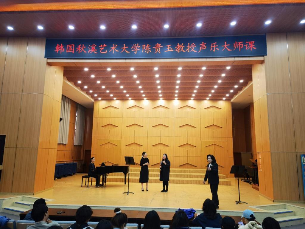 来访期间,代表团还参观了我校油陶作品陈列馆,深入了解我校特色艺术成果。下午,代表团一行到访音乐与舞蹈学院,为师生开展专题宣讲。宣讲结束后,秋溪艺术大学国际交流院长陈贵玉教授、公演艺术系金美榮教授为师生带来了一场生动的声乐大师课,并围绕艺术表演技巧、教学实践经验方法等内容展开互动交流,为两校后续教学合作与学术交流提供了宝贵的实践参考。(来源:对外合作与交流处 撰稿:罗迪 审核:王忠民 编辑:姜丰翼)