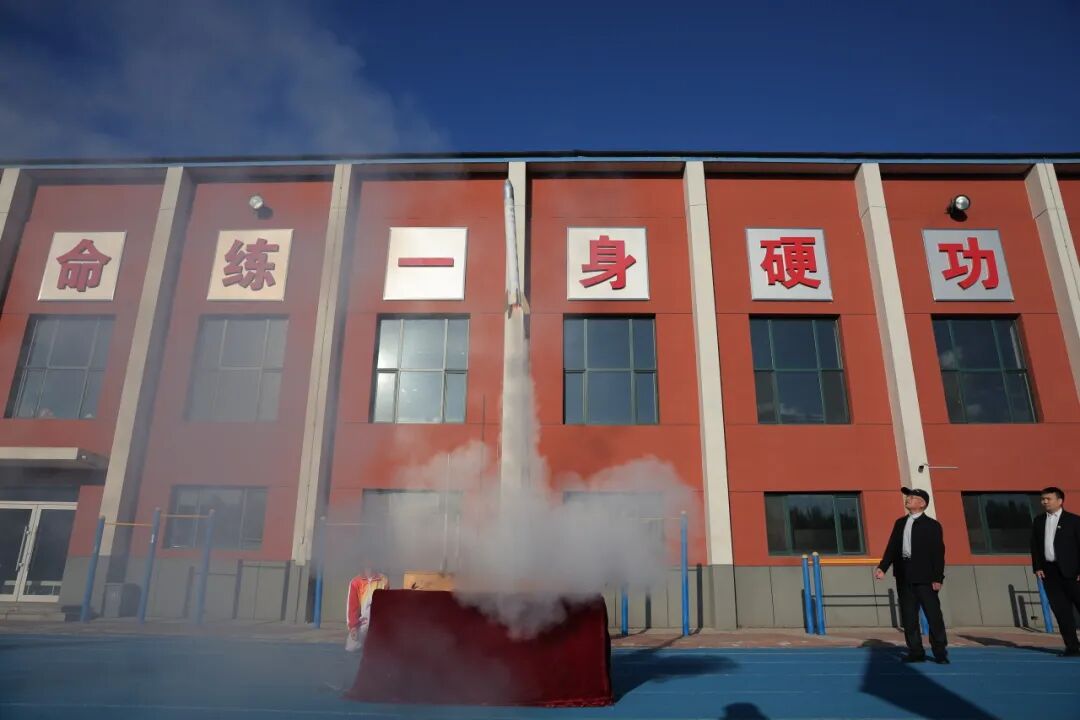 就在这时,操场一侧,一座由校友捐赠的火箭模型巍然矗立——银白色的箭体直指苍穹,犹如一支蓄势待发的利箭。当升旗仪式进入高潮,火箭模型四周的冷焰火骤然绽放,与飘扬的国旗交相辉映。火箭模型不仅承载着校友对母校的感恩,更点燃了庆师人“自强不息,臻于至善”的优良品质,大庆师范学院将带着校友的期待,奋进前行。