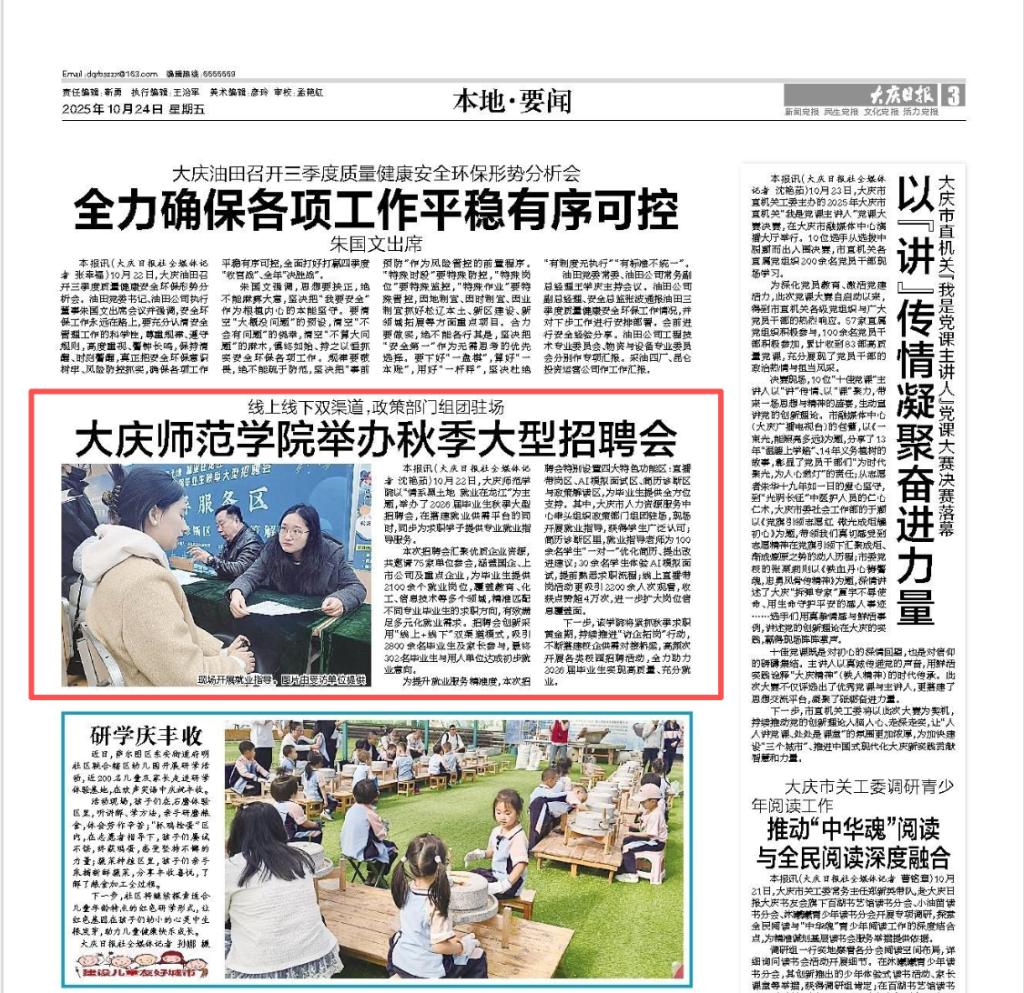 10月22日,“情系黑土地 就业在龙江”大庆师范学院2026届毕业生秋季大型招聘会在学校图书馆举行。校长、党委副书记张平,党委副书记滕强,党委副书记、工会主席刘迪亲临现场巡视指导,与用人单位深入沟通交流。招生就业处相关负责人、各二级学院党政领导、毕业生辅导员参加活动,为求职学生提供就业指导服务。