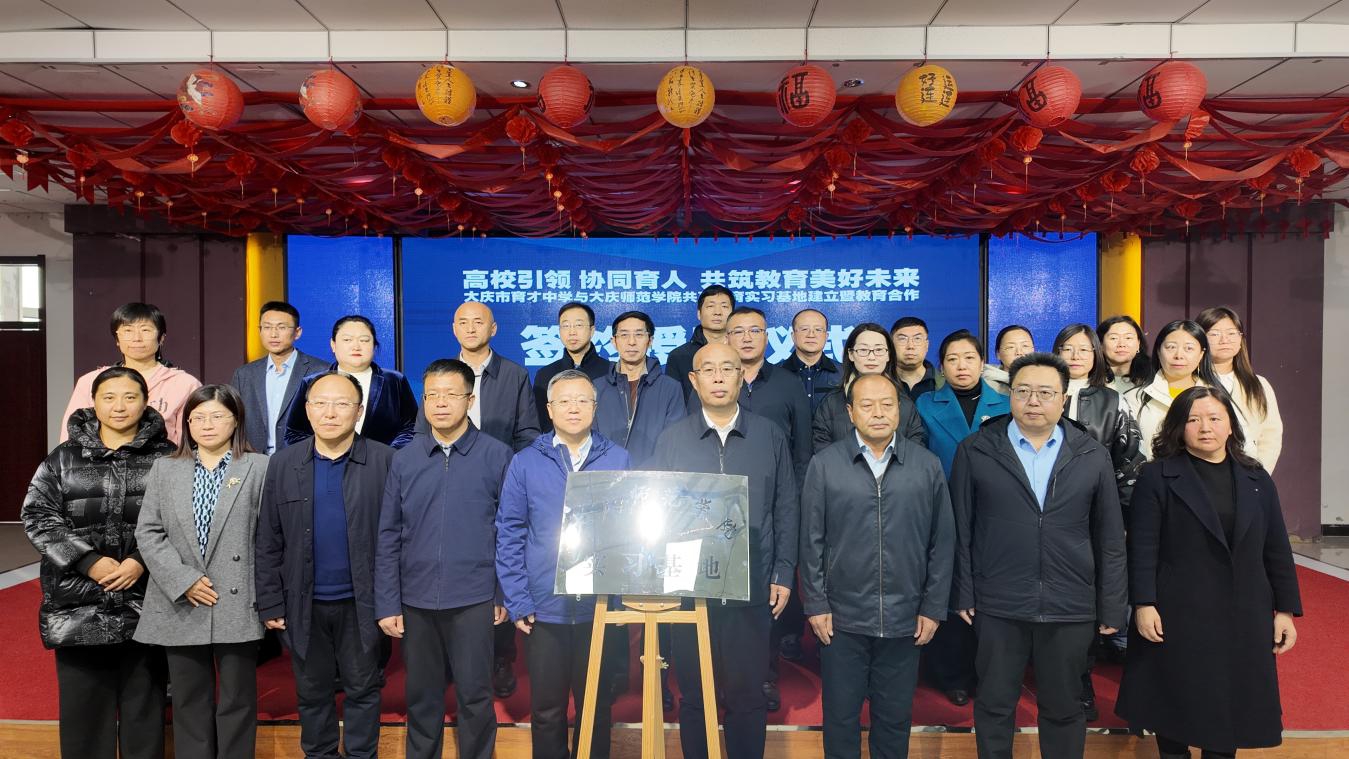 为深化校地协同育人机制,整合高校与基础教育优质资源,共同培育适应新时代要求的教育人才,11月5日,大庆师范学院与大庆市育才中学举行共建共享教育实习基地签约授牌仪式,携手开启合作新篇章。大庆师范学院副校长周丹,大庆市教育局党委委员、副局长王伟,教务处处长张国发,计算机科学与信息技术学院院长王健,育才中学党委书记王成双等双方单位领导及师生代表共同出席。