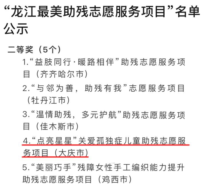 学校将以此次获奖为新起点,进一步优化项目服务内容,完善志愿者培训体系,探索“线上科普+线下陪伴”双轨服务模式,扩大项目在孤独症儿童家庭及社会层面的辐射范围,持续引导广大青年志愿者践行“奉献、友爱、互助、进步”的志愿精神,以更扎实的行动、更专业的服务,为推进龙江助残志愿服务高质量发展、共建文明和谐幸福龙江贡献更多青春力量。(来源:团委 撰稿:吕金凤 审核:王贺民 编辑:姜丰翼)