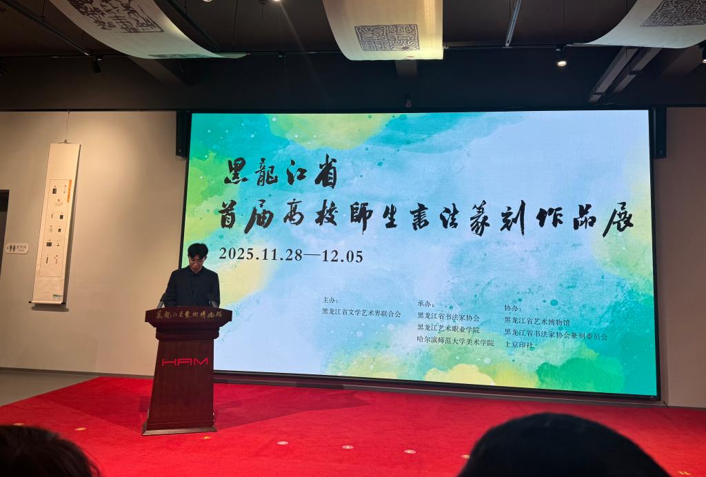 11月28日,黑龙江省首届高校师生书法篆刻作品展在黑龙江省艺术博物馆开幕。我校青年教师闫留学在本次赛事中斩获教师组金奖,并作为教师代表在开幕式上发表获奖感言,彰显了我校书法教育的扎实成效与青年教师的专业风采。