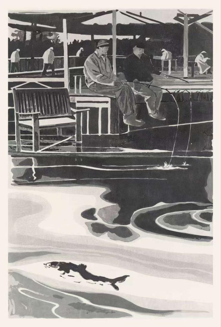 王迪长期深耕版画创作与教学研究,尤其在水印版画领域有着深入探索,始终坚持以时代为创作底色,在传承版画传统技艺的基础上,积极探索题材、形式与语言的创新表达。此次入选的水印版画作品《渔事钓客》,紧扣“镌刻时代” 的展览主题,以北方日常水系场景为创作题材,画面中粼粼水波与错落的岸边景致相映成趣,钓者静坐的姿态悠然自得,既还原了生活的质朴本真,又暗含对现代社会人们追寻宁静心境的思考。在艺术手法上,作品充分发挥水印版画的材质优势,以淡墨印染营造朦胧的意境,用细腻的线条勾勒人物与场景的细节,色彩上以清雅的墨色为主调,搭配局部冷色调点缀,既展现出水印版画特有的温润质感与层次美感,又赋予画面鲜活的生命力,将个人艺术思考与时代精神相融合,传递出对现实生活的观察与对文化传承的坚守,充分体现了当代青年艺术家的责任与担当。