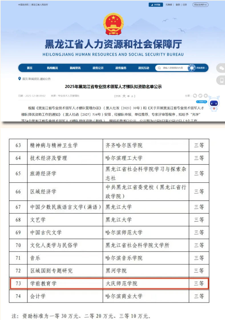 近日,黑龙江省人力资源和社会保障厅公布了黑龙江省专业技术领军人才梯队择优资助名单。大庆师范学院“学前教育学”人才梯队成功入选,彰显了我校在该学科领域的专业实力与人才优势。
