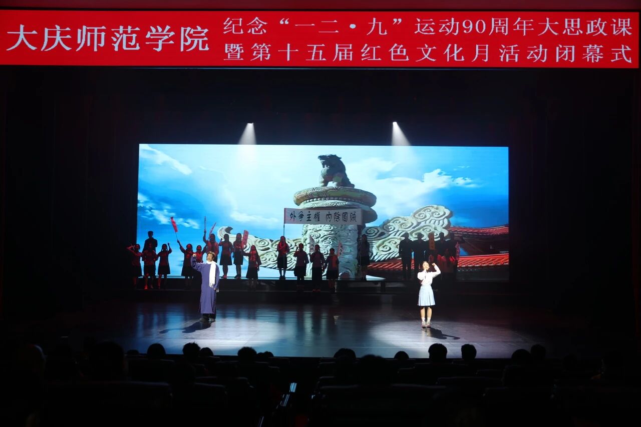 为纪念“一二・九”运动90周年,弘扬爱国主义精神,引领青年学子传承红色基因、坚定理想信念,12月8日晚,大庆师范学院在大学生活动中心举行“传承红色薪火 奋进时代征程”纪念“一二・九”运动90周年大思政课暨第十五届红色文化月活动闭幕式。校长、党委副书记张平,党委副书记滕强,党委副书记、工会主席刘迪,副校长周丹、王洪秋,党委委员、宣传统战部部长徐媛等校领导出席,与各机关部门、二级学院负责人、辅导员及学生代表共同观看这堂融思想性、艺术性、教育性于一体的大思政课。