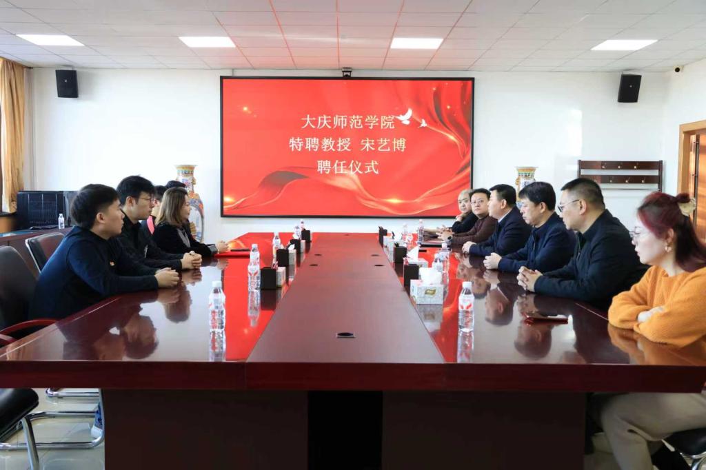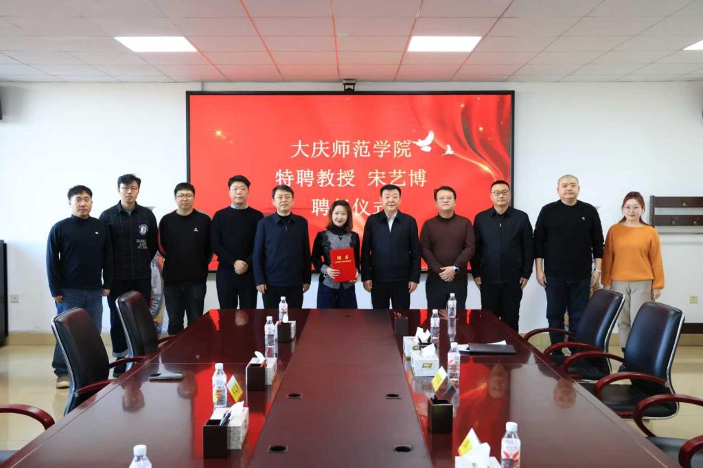 1月5日下午,大庆师范学院在主楼633会议室举行特聘教授聘任仪式,国内民族打击乐领域顶尖专家、北京民族乐团副团长宋艺博受聘为学校特聘教授。副校长许双毅为宋艺博颁发聘书,仪式由音乐与舞蹈学院院长任广明主持,学院党总支书记张雷、副院长陈毓博及教师代表参加了仪式。