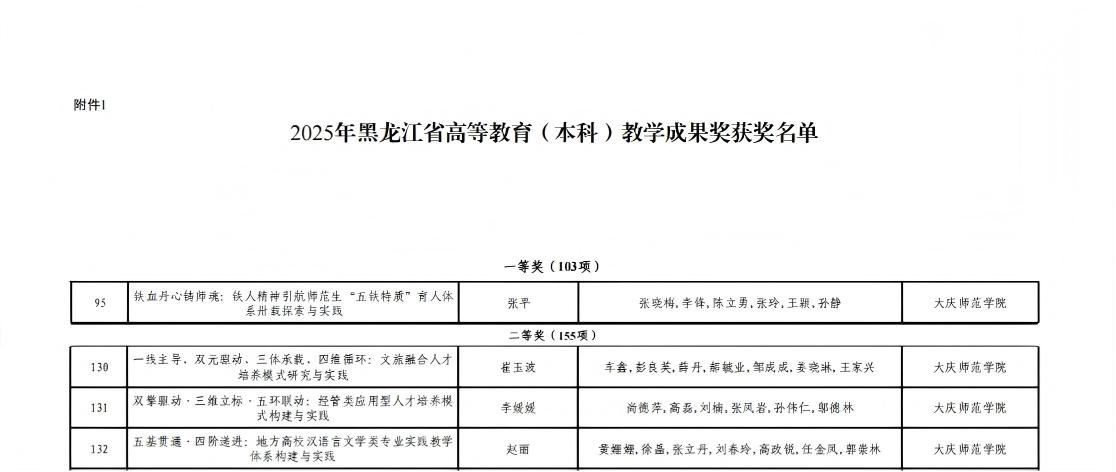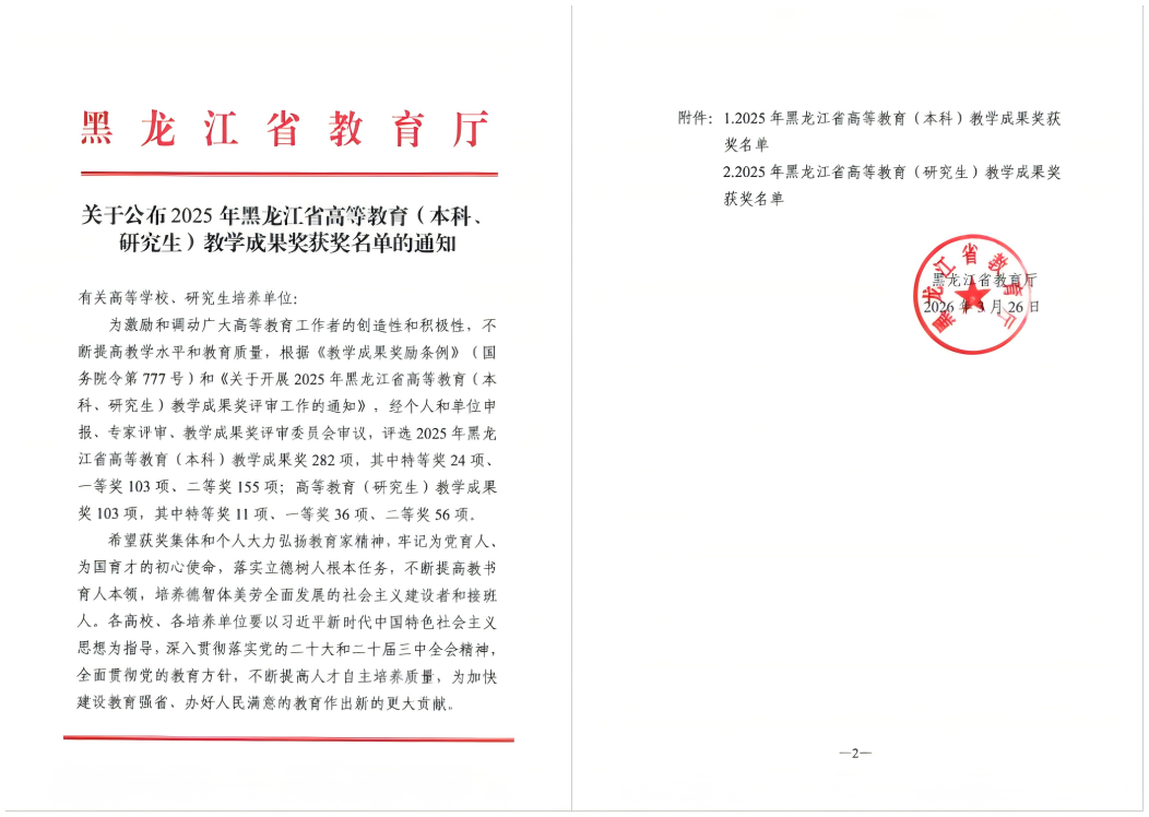 近日,黑龙江省教育厅正式公布2025年度高等教育教学成果奖获奖名单。我校推荐的七项教学成果中,四项凭借扎实的研究基础和显著的育人成效脱颖而出,成功获奖。其中,张平教授主持的成果荣获一等奖,崔玉波、李媛媛、赵丽老师分别主持的三项成果荣获二等奖。这一成绩充分展现了我校在教育教学改革与人才培养方面的综合实力。