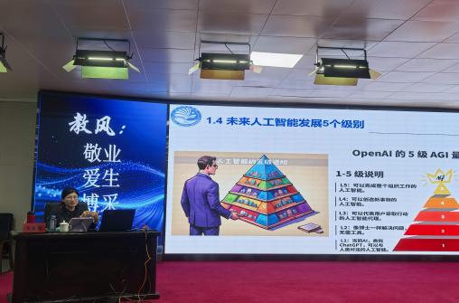 培训内容聚焦“了解人工智能与大模型”这一主题,围绕人工智能发展简史、人工智能思维、大模型原理、AIGC教学应用四大模块展开,系统解析了人工智能的技术演进与教育融合路径。培训过程中,贾美娟老师从人工智能发展简史切入,梳理技术发展的关键阶段与分级体系;进而引导参训教师构建“AI+”教育思维,理解智能时代教学理念的转型方向;在技术解析环节,重点阐释大模型的基本原理、分类特征与典型平台;最后通过AIGC实践案例,现场演示文本生成、图像处理、视频生成等教学场景应用,生动展现大模型为教育教学带来的创新可能。