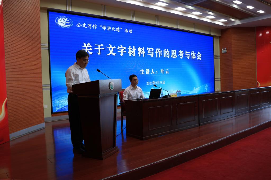 在组织校院两级机关干部认真学习《党政机关公文处理工作条例》及配套文件的基础上,9月28日,公文写作专题辅导报告会在图书馆博雅讲堂顺利举行。报告会特邀大庆市委政策研究室副主任叶云进行专题授课。他以《关于文字材料写作的思考与体会》为题,系统阐述了文字材料的重要性、形式体例及写作能力提升路径,结合多年实战经验,从理论与实务双重角度深度解析公文写作规律,并分享了一系列实用方法与注意事项,切实增强了参会人员的公文标准化意识和实务操作能力。